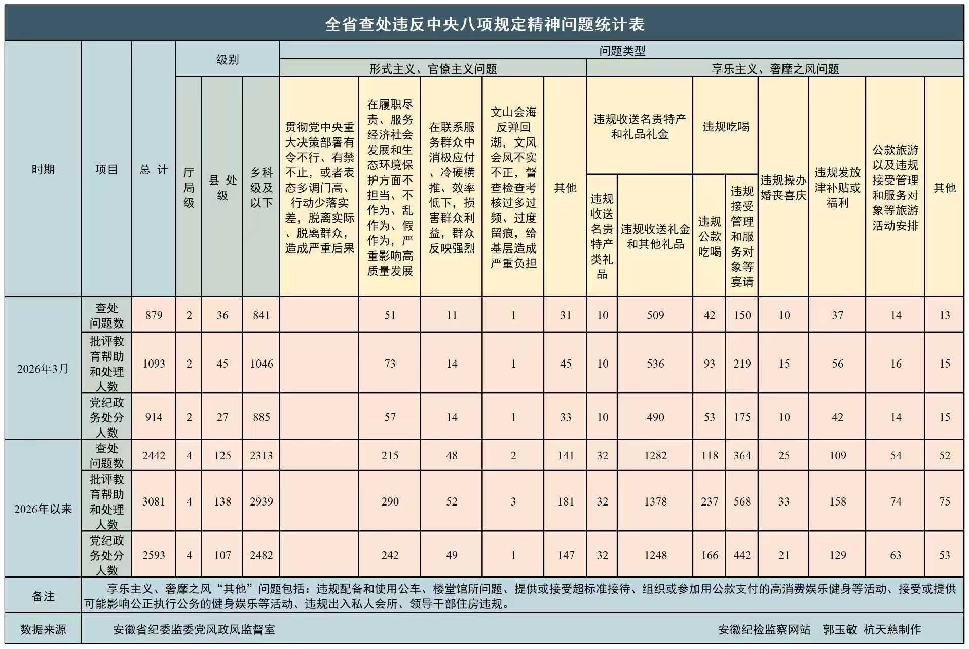 2026年一季度,全省纪检监察机关共查处违反中央八项规定精神问题2442起,批评教育和处理3081人,其中党纪政务处分2593人。