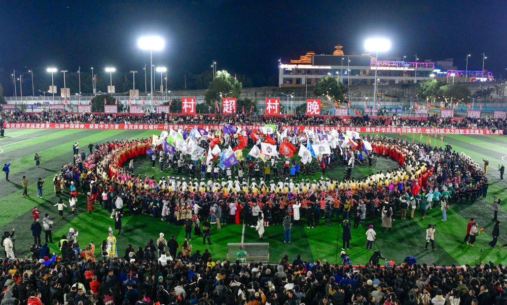 2026年1月2日,人们在贵州榕江县举行的第四届贵州“村超”开幕式暨“村超村晚”活动现场一起跳民族舞蹈“多耶”。新华社记者 杨文斌 摄